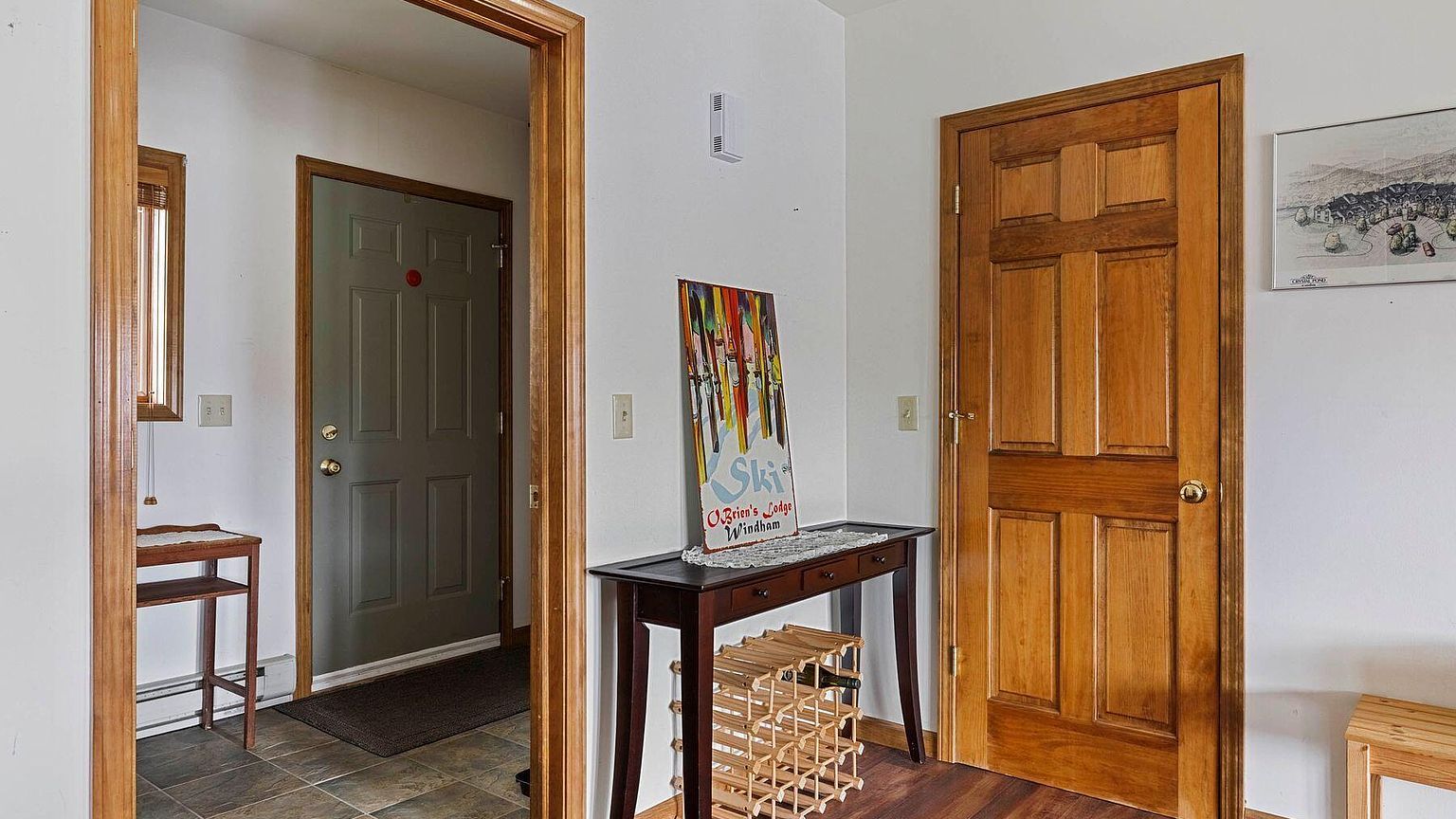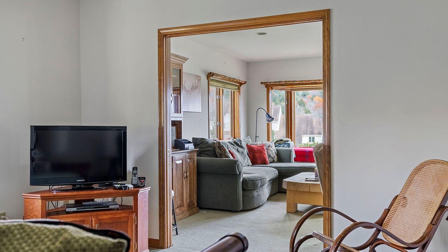 This versatile first-floor suite currently serves as a cozy home office, featuring crisp white walls framed by warm natural wood trim. The grand arched doorway creates elegant flow between work and relaxation areas, while natural light energizes the environment throughout the day. Perfect for remote work, homework, or quiet reading time.
